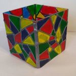 2015Waxinelichthouder, beschilderde kubus met loodband.